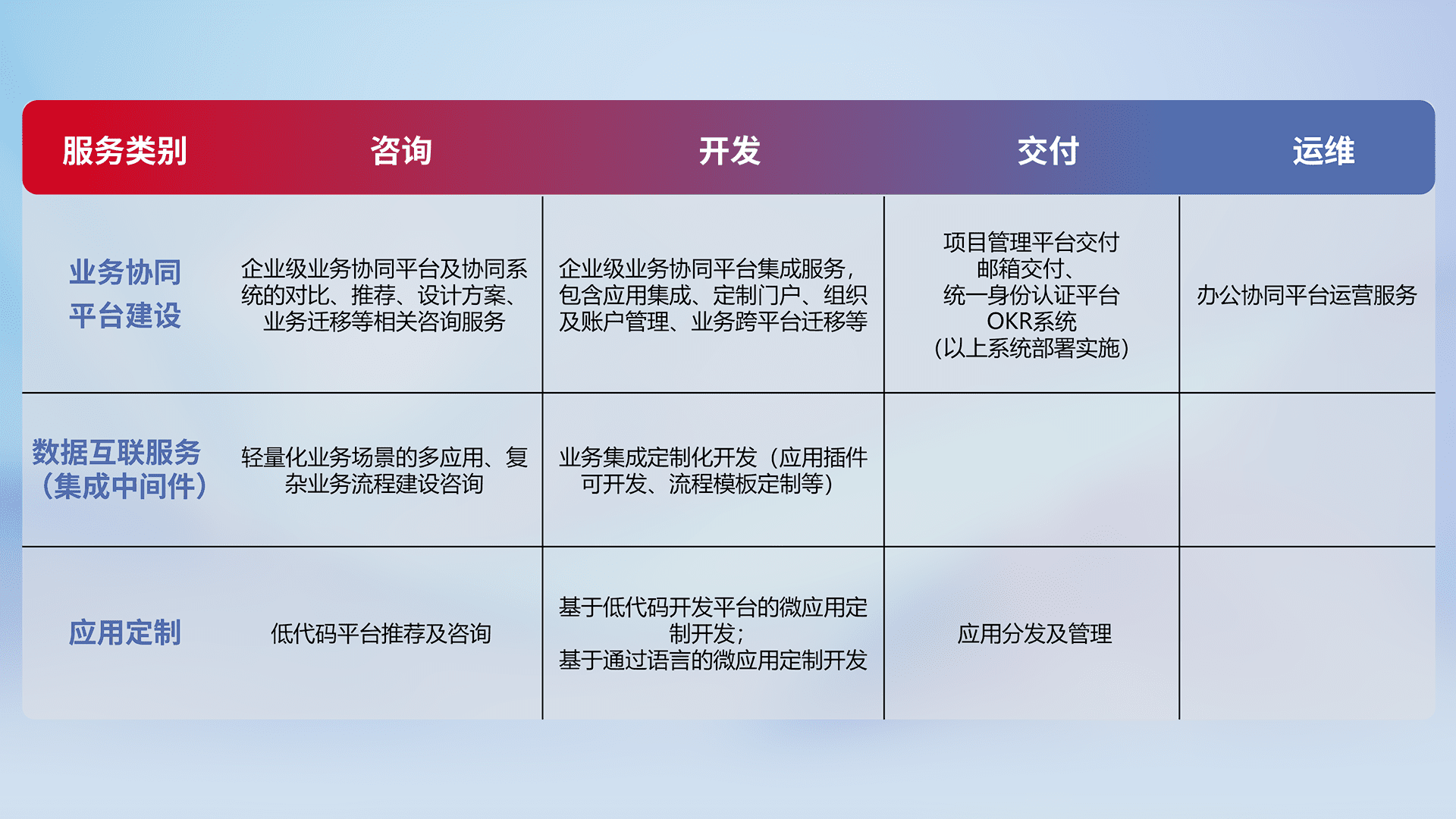 针对钉钉、、、、企微、、IDaas等平台级产品提供产品的规划、、方案、、交付、、、定制化开发等服务,,,,实现如统一协同办公、、、、智能客户服务、、、、混合会议管理、、、智能数据查询、、、等业务场景,,,,实现数字化转型。。