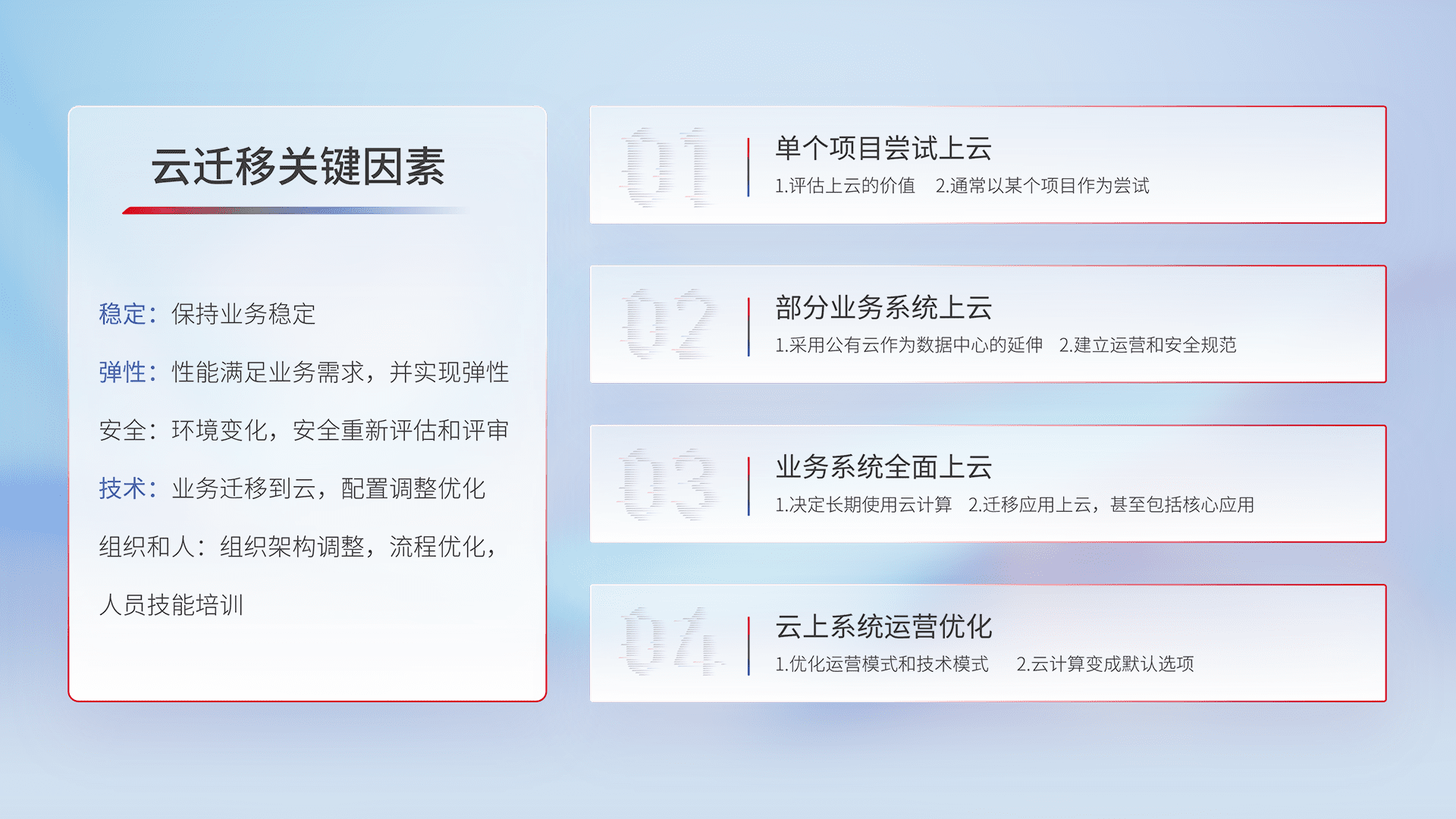 结合实际业务,,,从规划设计、、、云平台选型、、云原生改造、、、、数据迁移、、集成交付,,,迁移全过程为客户识别最佳上云路径,,,,做好风险识别管理,,,,设计网络架构、、、身份权限、、安全审计合规、、操作审计、、日志审计、、、、监控告警策略、、、多站点容灾设计等,,,,对云上基础设施进行整体规划,,,,提升IT治理水平,,,以满足弹性、、、高可用、、、、高性能的需求。。。